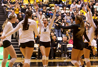 Members of the No. 4 Missouri volleyball team (34-0, 18-0 SEC) took their seats at the front of the room. Fans and media milled around snacking on pizza. A broadcast of the Tigers’ win at Florida streamed on a projector in the background. The SEC volleyball championship trophy sat unassumingly on a back table.